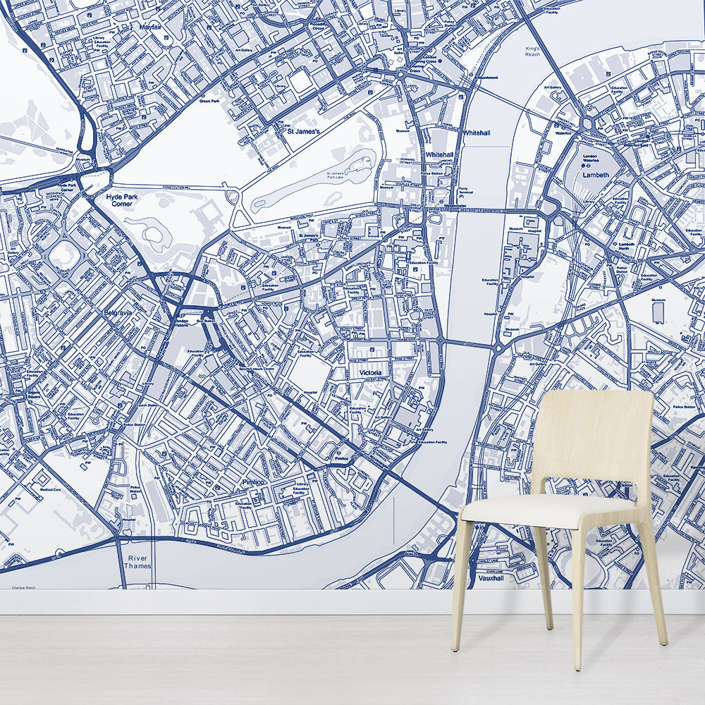 Transform your walls with Wallpapered’s Custom Street Map Wallpaper in Blue, designed for an elegant and detailed street-level view.